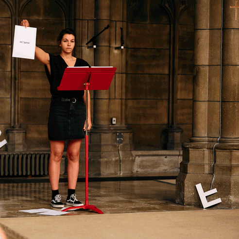 Au commencement, lettres en PMMA dispersées dans l’espace d’exposition, 2022.